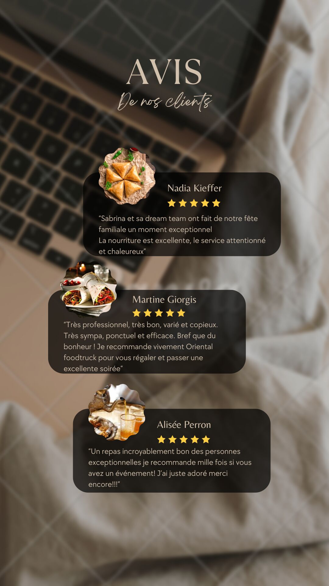 Offrez à vos invités un moment gourmand et convivial avec Oriental Food Truck ! Pour vos événements d’entreprise ou familiaux, nous vous proposons une cuisine généreuse, inspirée des saveurs orientales et préparée avec des ingrédients frais et de qualité.